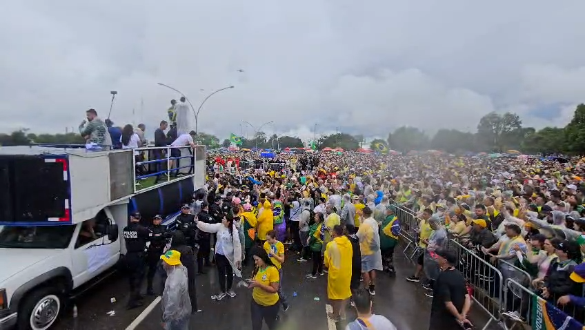 Mesmo sob precipitação constante, os presentes mantiveram o entusiasmo enquanto aguardavam a chegada das lideranças políticas. O público entoou cânticos de protesto direcionados ao governo do presidente Luiz Inácio Lula da Silva e críticas ao Partido dos Trabalhadores (PT).