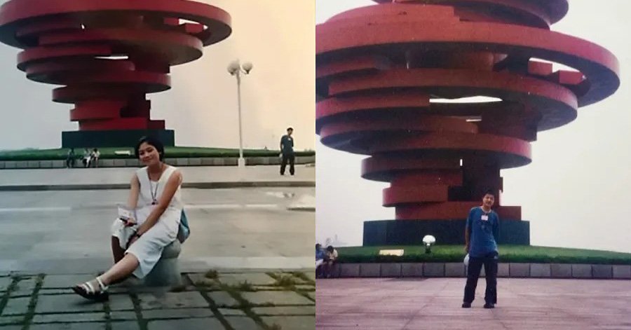 O fato se deu em julho de 2000, quando Xue e Ye eram adolescentes e não se conheciam. Ambos fizeram viagens separadas à cidade de Qingdao, na China. Durante um passeio, Xue foi fotografada em frente à notória escultura que celebra o Movimento de Quatro de Maio, um evento histórico fundamental na China. O que era totalmente desconhecido para ela é que Ye estava na mesma foto, em segundo plano, a poucos metros de distância, enquanto era fotografado com seu grupo de turismo.