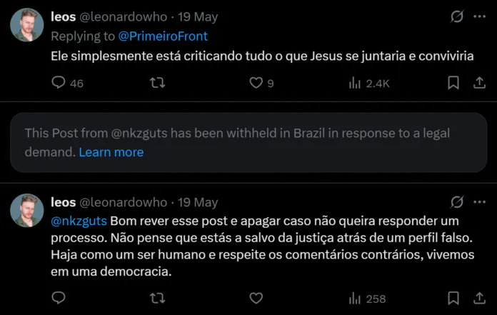 Já no segundo processo, Utech criticou o Papa Leão XIV, e um usuário chamado @nkzguts respondeu com um comentário de cunho sexual. Assim como no caso anterior, o juiz considerou a postagem ofensiva e solicitou sua remoção mundial.