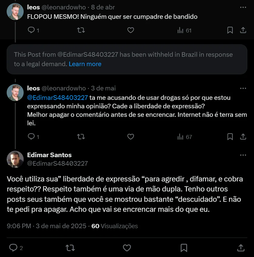 No primeiro caso, um usuário chamado Edimar Santos respondeu a uma provocação de Utech, que zombava de manifestantes do 8 de janeiro. A resposta de Santos, um comentário sobre o uso de maconha, foi considerada ofensiva pelo juiz. O X, que já havia removido a postagem no Brasil, foi então instruído a deletá-la completamente.