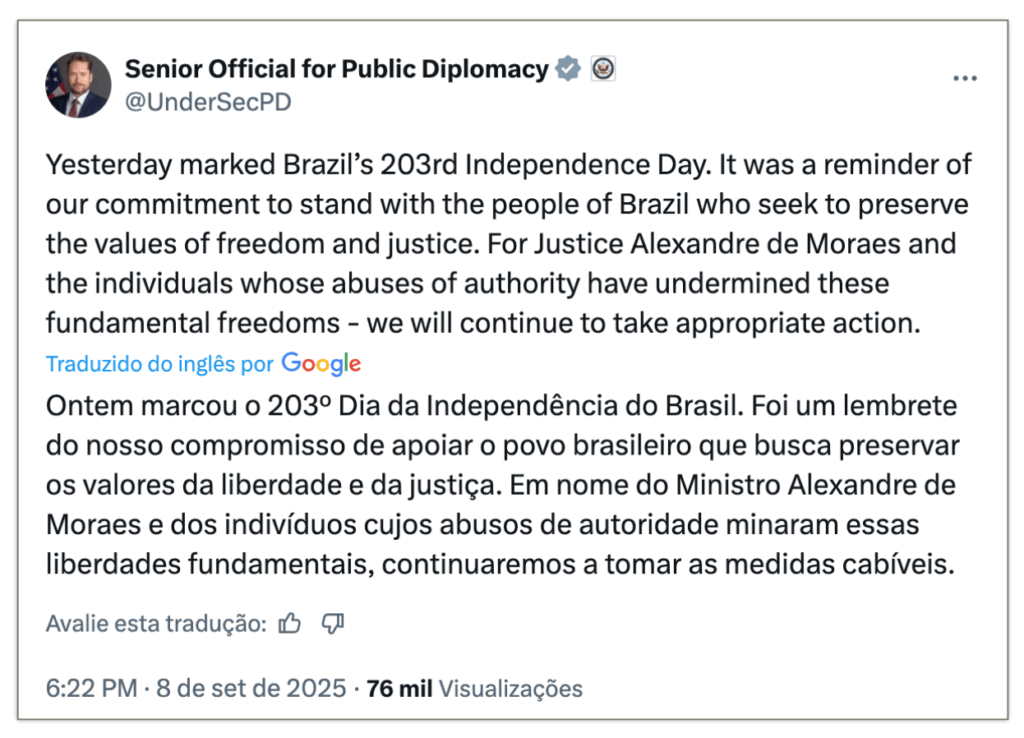 O subsecretário de Diplomacia Pública dos Estados Unidos, Darren Beattie, declarou nesta segunda-feira (8.set.2025) que o governo do presidente Donald Trump (Partido Republicano) seguirá adotando medidas contra o ministro do STF (Supremo Tribunal Federal) Alexandre de Moraes, alvo de sanções pela Lei Magnitsky. A manifestação do assessor do secretário de Estado, Marco Rubio, ocorreu um dia após as mobilizações em apoio ao ex-presidente Jair Bolsonaro (PL) no 7 de Setembro.