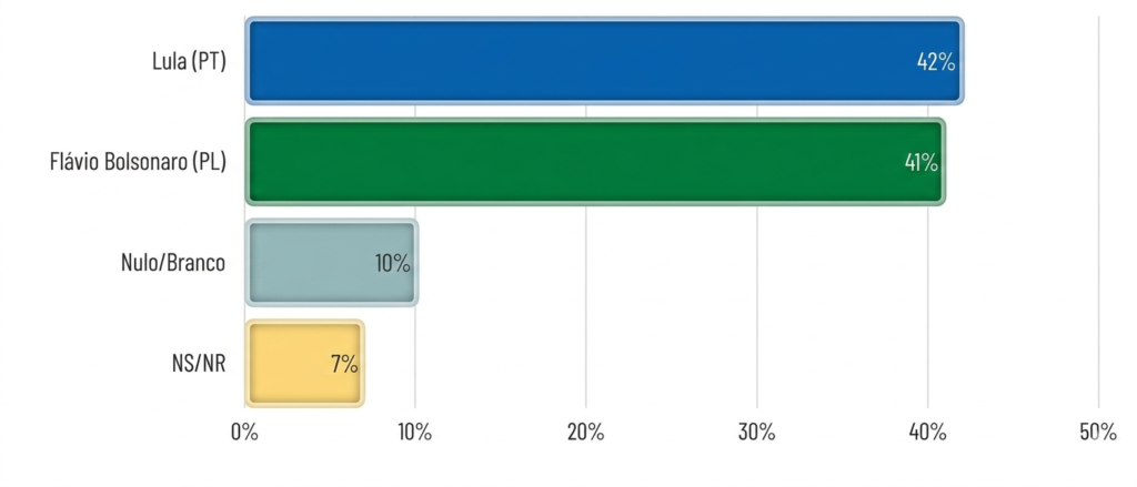 No primeiro cenário de confronto direto, Lula soma 42% das intenções de voto contra 41% de Flávio Bolsonaro. Considerando a margem de erro, os dois candidatos estão numericamente empatados. De acordo com o instituto, 10% dos entrevistados votariam em branco ou nulo, enquanto 7% não souberam responder.