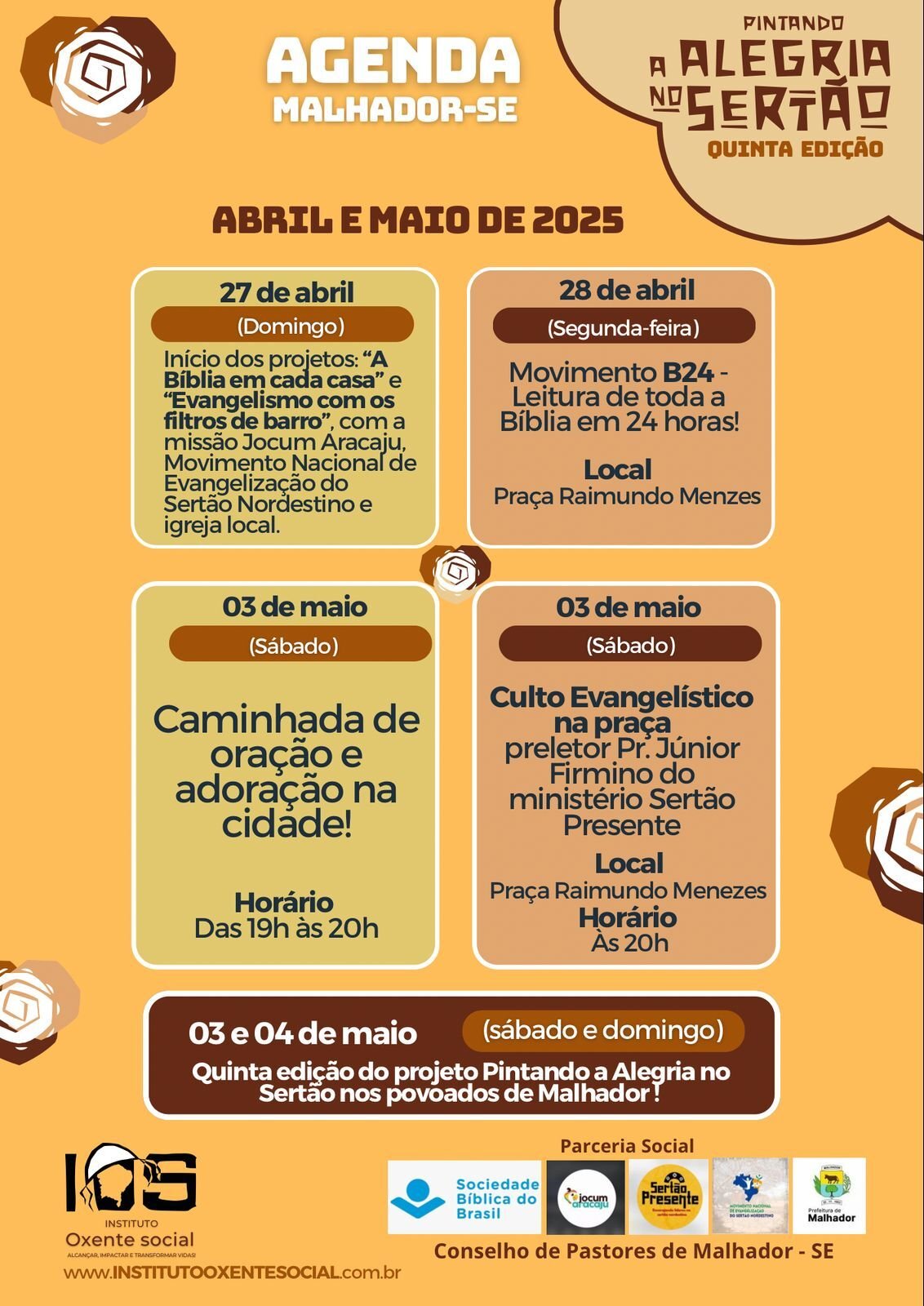 • 03 e 04 de maio (sábado e domingo): Grande mutirão de pintura de casas e ações sociais nos povoados de Malhador, dentro da quinta edição do projeto.
