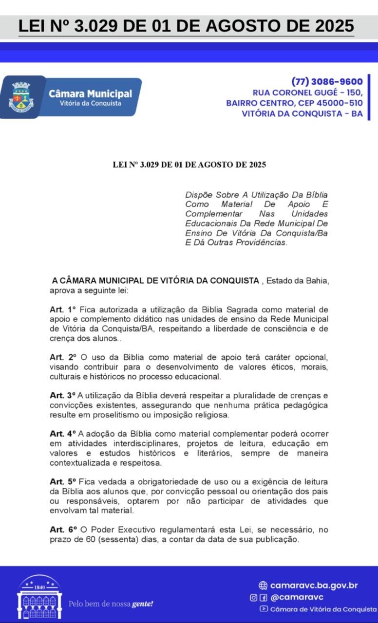 A Câmara Municipal de Vitória da Conquista (BA) aprovou, em sessão realizada no dia 4 de junho de 2025, o Projeto de Lei nº 56/2024, que autoriza a utilização da Bíblia como material de apoio didático complementar nas escolas da rede municipal. A proposta, de autoria do vereador Edivaldo Ferreira Júnior (PSDB), foi sancionada pelo presidente da Câmara após obter 17 votos favoráveis e um contrário.