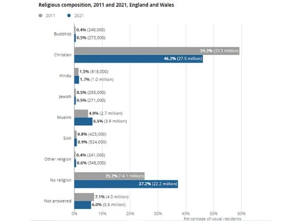 O último censo nacional, realizado em 2021, revelou que apenas 46% dos britânicos se identificam como cristãos – uma queda em relação aos 59% registrados em 2011. Paralelamente, o grupo de pessoas sem religião aumentou para 22,2 milhões (37,2%), enquanto a população muçulmana cresceu de 2,7 milhões para 3,9 milhões no mesmo intervalo.