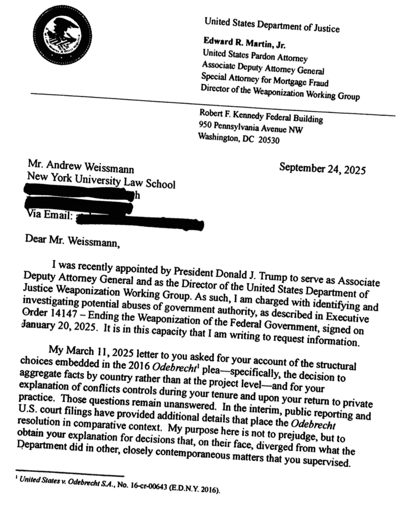 O procurador também afirma que Weissmann, que era o responsável pela Seção de Fraudes do DOJ, não respondeu à sua comunicação anterior, enviada em março, e deu o prazo de 7 de outubro para que fossem apresentados novos esclarecimentos. Em 2016, a Odebrecht formalizou um acordo judicial com autoridades dos Estados Unidos, Brasil e Suíça, no qual admitiu o pagamento de US$ 788 milhões em propinas a políticos, funcionários públicos e partidos em 12 países.