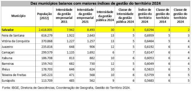 Entre as 5.570 cidades brasileiras avaliadas, apenas algumas são classificadas como Centros de Gestão, ou seja, aquelas que concentram instituições públicas federais e estaduais, além de sedes ou filiais de grandes empresas. Na Bahia, Salvador ocupa a 9ª posição no ranking nacional e a 3ª no Nordeste, seguida por Feira de Santana, Vitória da Conquista, Juazeiro e Camaçari.
